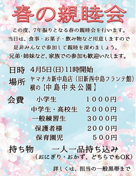 日本傳 拳生館空手道場に関連する大会・行事のイベントについてお知らせします。 『春の親睦会』についてのお知らせ ![]() 『日本武芸奉賛会主催 第49回 神宮武芸奉納会』 についてのお知らせ 『日本武芸奉賛会主催 第49回 神宮武芸奉納会』の日程が 決定いたしました。下記の日程で予定しております。 『日本武芸奉賛会主催 第49回 神宮武芸奉納会』 5月24日(日) 尚、詳細については改めて報告、掲載いたしますので しばらくお待ち下さい。 『令和8年 新年会』についてのお知らせ 1月3日(土)道場にて行われた 『令和8年 新年会』は天候にも恵まれ 無事終了いたしました。 御参加、御協力頂いた御家族の皆様 道場関係者の皆様 誠に有難うございました。 『令和8年 新年会』の様子を ギャラリー内のギャラリー4にて掲載しています。 『編集が完了しました』 『令和7年度 拳生館練習納め』 『令和7年度 拳生館 秋の親睦会』 の様子をギャラリー内ギャラリー4にて掲載しています。 また準備中のフォトアルバムは準備が整い次第順次 掲載していきますのでしばらくお待ちください。 『道場年末年始練習と冬休み』 についてのお知らせ 年末年始のお休みは下記の通りとなります。 (12月1日現在)